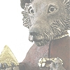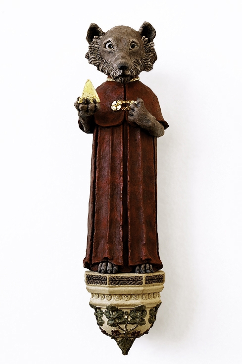 H/W/D = 42/12/14 cm, fired clay, oil paint, partly plated with 24ct gold leaf
