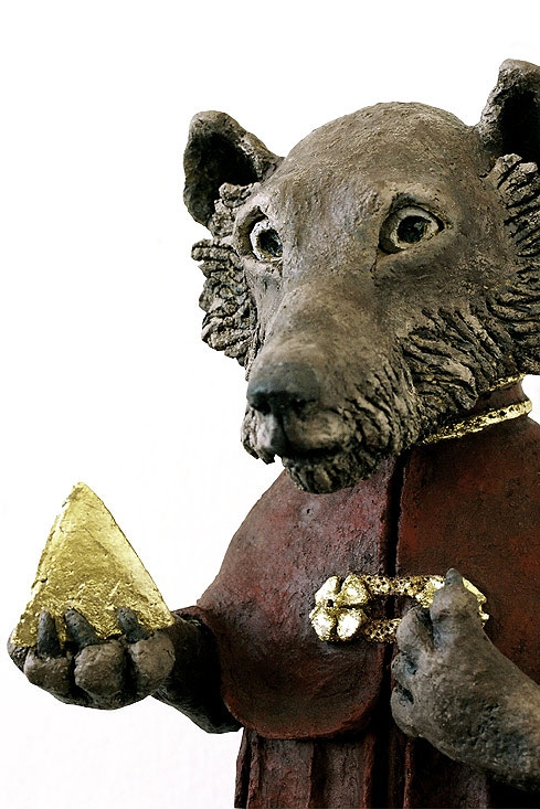 H/W/D = 42/12/14 cm, fired clay, oil paint, partly plated with 24ct gold leaf
