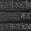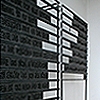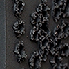 Two large metal frameworks in which black clay panels riddled with holes are mounted close together: hundred of spots, glowing and shining, reflections of a bright wall penetrate through the holes in the black clay tiles.