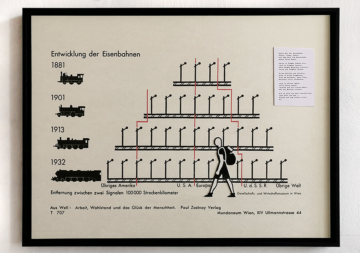 Collage unter Verwendung der Bildtafel „Die Entwicklung der Eisenbahn“, eines Piktogramms von Gerd Arntz und des Gedichts „Luftveränderung“ von Kurt Tucholsky.