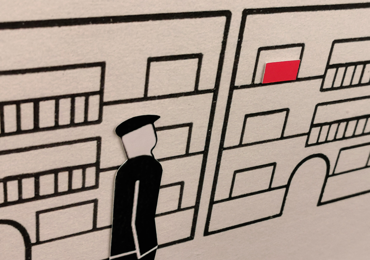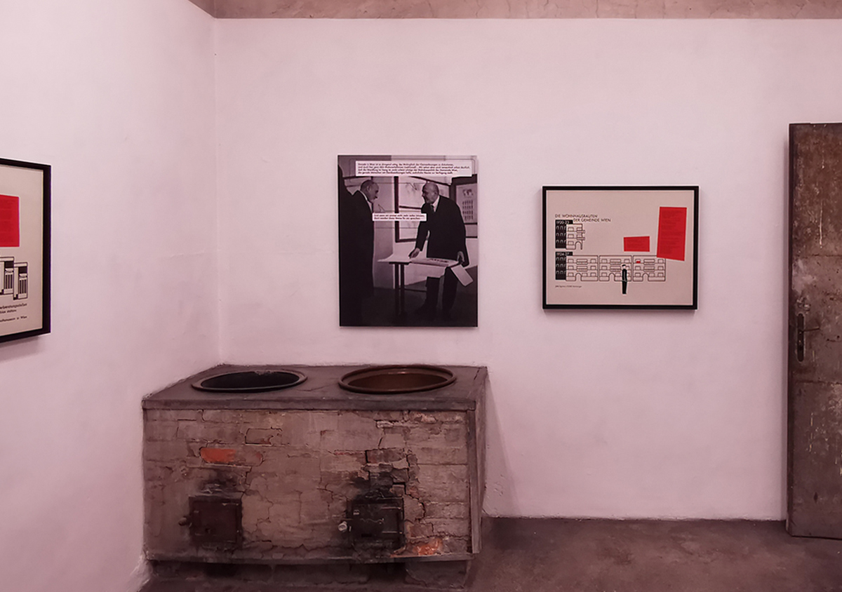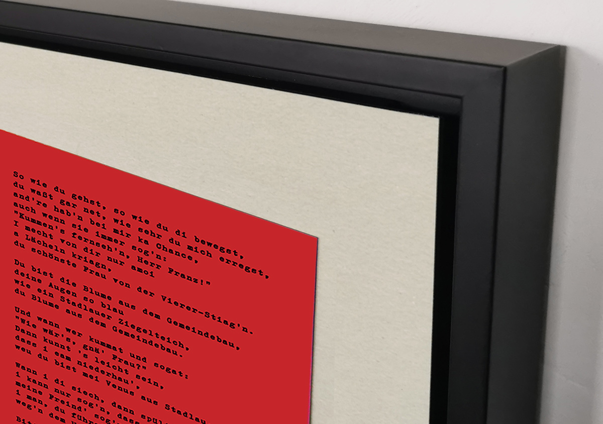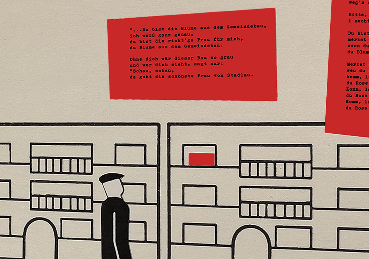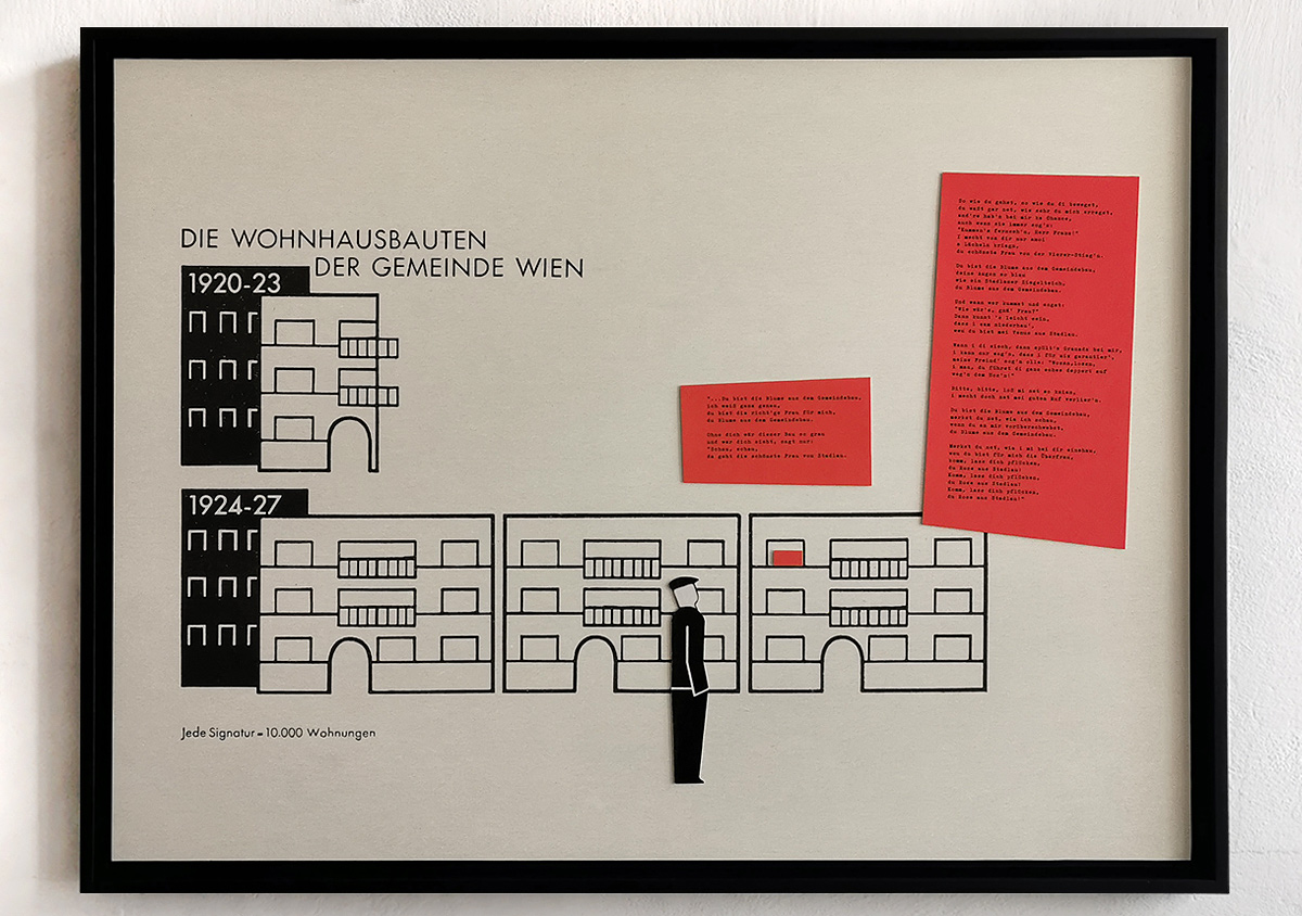 Collage unter Verwendung der Bildtafel „Die Wohnhausbauten der Gemeinde Wien“, eines Piktogramms von Gerd Arntz und des Liedtexts „Die Blume aus dem Gemeindebau“ von Wolfgang Ambros und Joesi Prokopetz (1977)