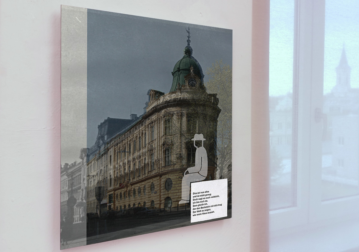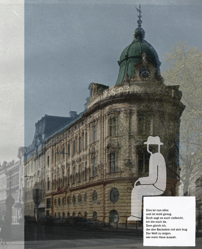 Das Bild zeigt in Überblendung zweier Fotos das Haus Ullmannstrasse 44 in 1150 Wien. Eine Aufnahme stammt aus 1930, zu sehen ist noch der alte Sparkassen-Schriftzug. Die andere Aufnahme zeigt den heutigen Istzustand des Gebäudes.