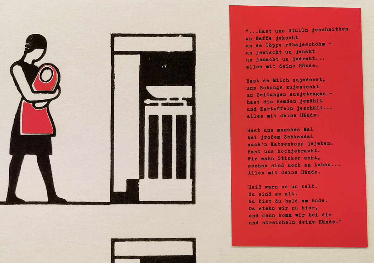 Otto Neurath stellte bildstatistischen Tafeln nicht nur in Wien, sondern auch in anderen Großstädten Europas aus: „Mutterberatung der Gemeinde Wien“ wurde beispielsweise 1929 in Berlin-Kreuzberg in der Ausstellung „Wien im Bild“ gezeigt. Ort der Ausstellung war das Gesundheitshaus am Urban. Aus diesem Grund habe ich Neuraths Tafel mit Kurt Tucholskys Gedicht „Mutterns Hände“ ergänzt, in welchem ein Kind in Berliner Mundart die tägliche, unermüdliche Arbeit seiner Mutter in Dankesworten würdigt: