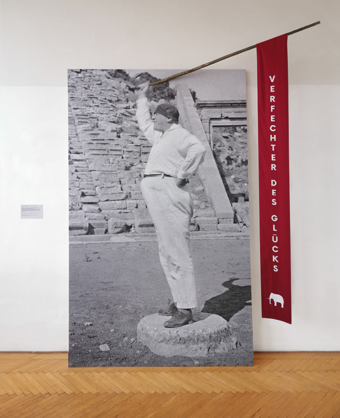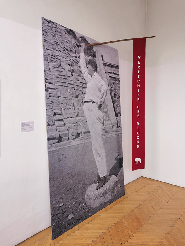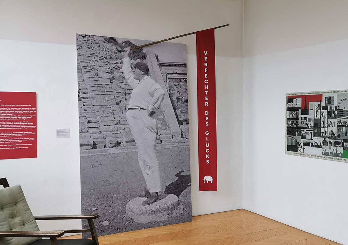 In meiner Installation präsentiert sich Otto Neurath in Lebensgröße als fahnenschwingender Kämpfer für seine Utopie eines glücklichen Lebens für alle. Eng mit den Idealen des „Roten Wiens“ verzahnt, wird er selbst Allegorie seines unermüdlichen Bemühens, besonders die Lebens- und Bildungssituation der Arbeiterschaft zu verbessern.