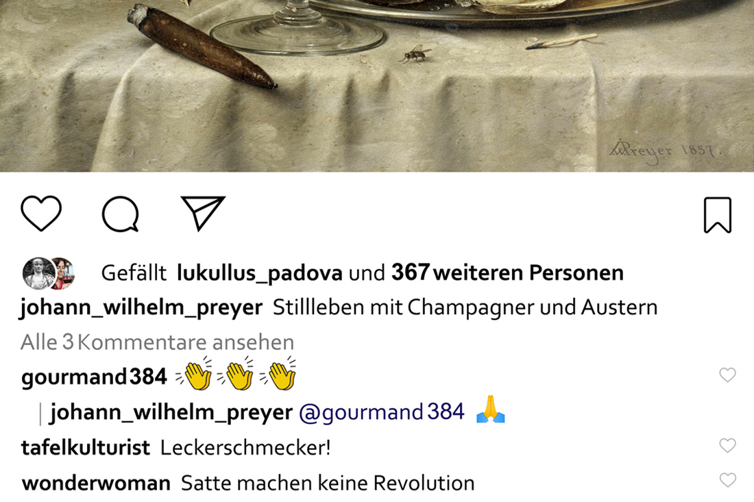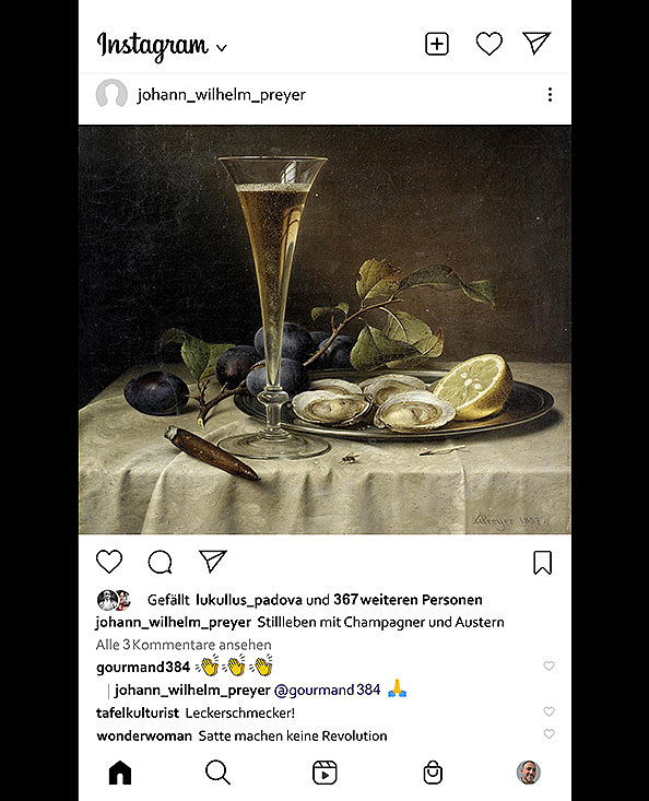 Im fiktiven INSTAGRAM-Account des deutschen Malers Johann Wilhelm Preyer (1803-1889) postet dieser sein „Stillleben mit Champagner und Austern“, garniert allerdings mit Symbolen von Vanitas-Darstellungen.
