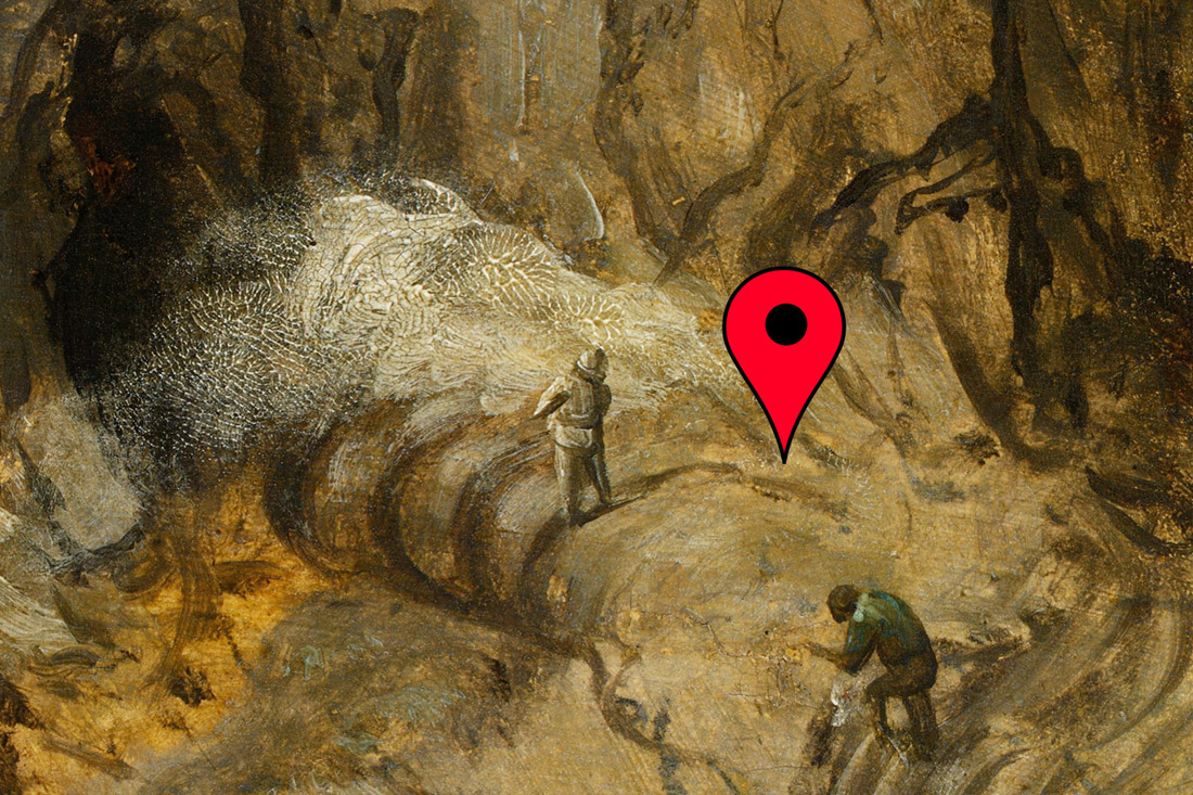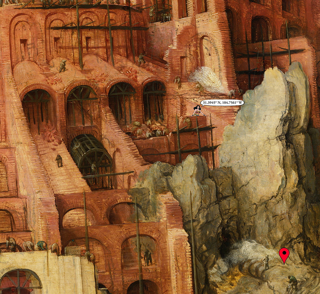 Die im Bild genannten Koordinaten bezeichnen punktgenau den Ort der Raketenabschussrampe des Blue-Origin-Unternehmens von Jeff Bezoz in Texas. Der Turmbau zu Babel (Pieter Bruegel der Ältere, 1563) ist Metapher für die Hybris mancher Menschen und deren Drang, selbst den Himmel beherrschen zu wollen.