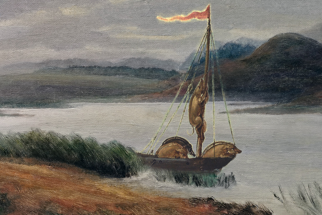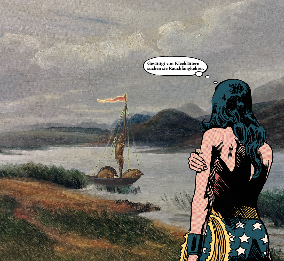 Das Bildzitat der Schweine auf dem Boot entstammt dem Gemälde „Die Versuchung des Heiligen Antonius“ von Jan Mandyn (1500-1560), die Seenlandschaft selbst ist meine digitale Weiterentwicklung eines Ölbildes, Ende des 19. Jahrhunderts, ohne Signatur.