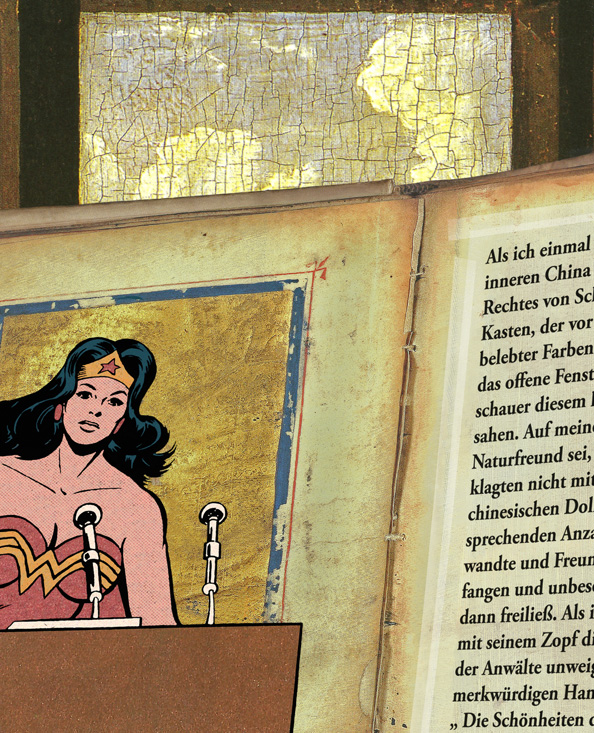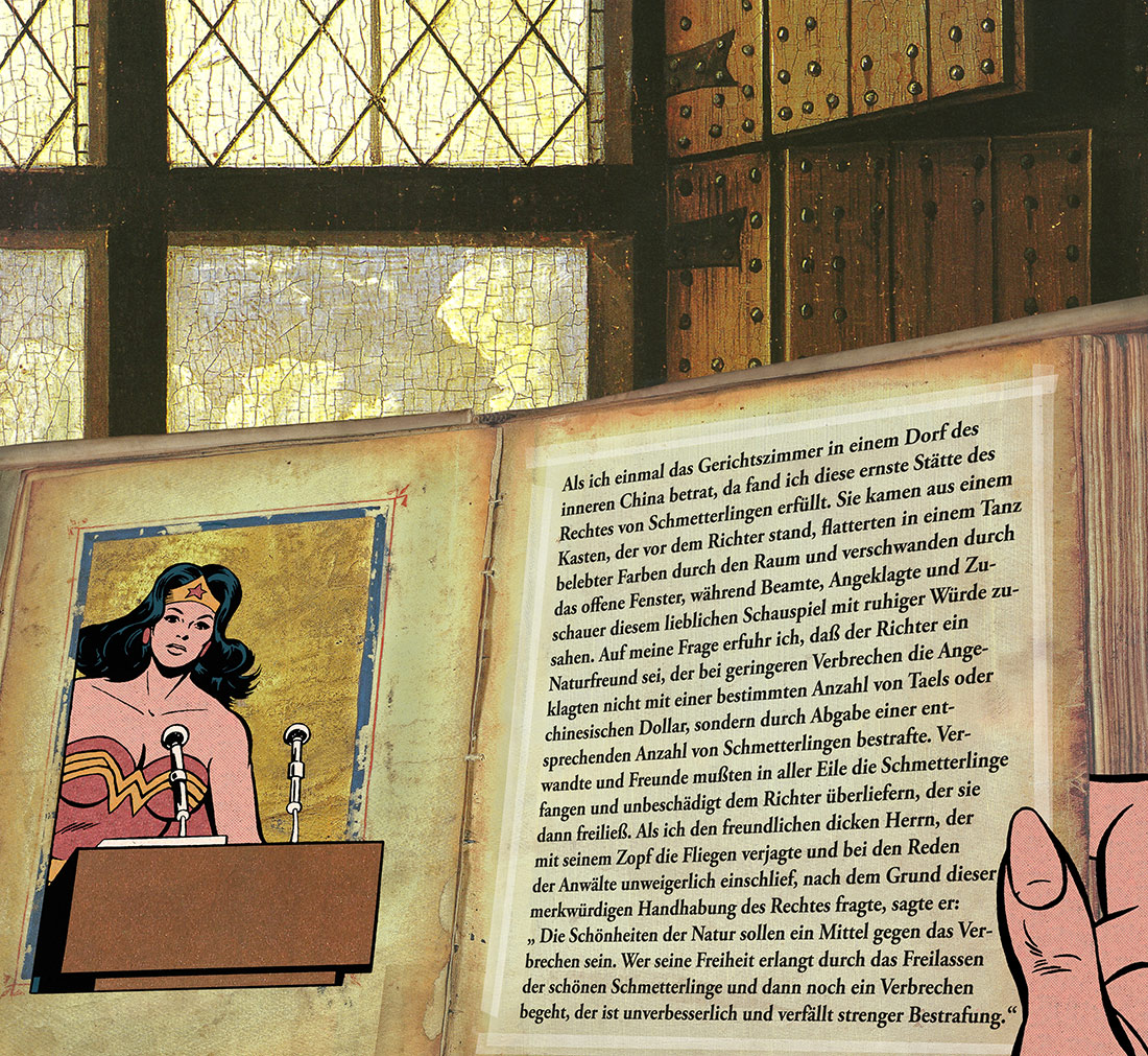 In Form eines fiktiven Vortragtextes, also nicht in einer Sprech- oder Gedankenblase, äußert sich Wonder Woman in dieser Collage.