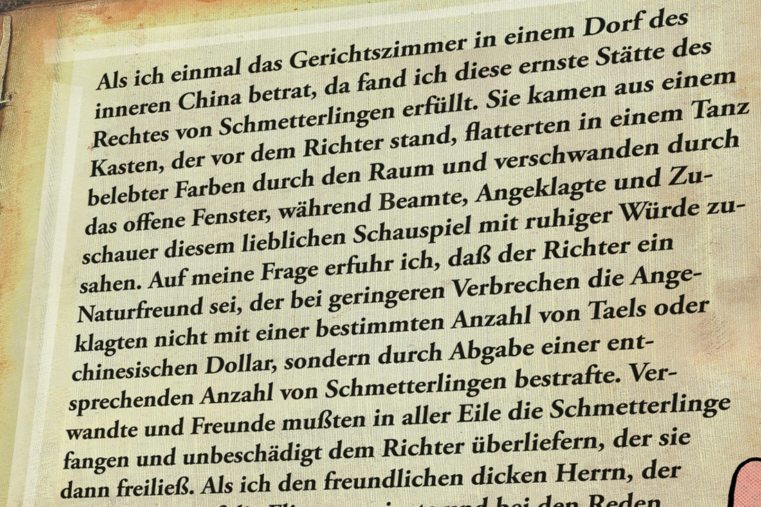 Der abgebildete Text stammt von Herbert Müller-Guttenbrunn (1887-1945), einem österreichischen Satiriker, Dramatiker und vehementen Kriegsgegner. Er gab „Das Nebelhorn“ heraus, eine Zeitschrift, die er Karl Kraus in Anlehnung an dessen „Fackel“ widmete. Die Erzählung in meinem Bild „Schmetterlinge“ ist dem Buch „Alphabet des anarchistischen Amateurs“ entnommen, in dem verschiedene Aphorismen und satirische Betrachtungen aus dem „Nebelhorn“ zusammengefasst sind. Sie ist dort unter „R“ mit dem Titel „Rechtspflege einmal anders“ zu finden. Das Buch ist im Verlag Matthes und Seitz, Berlin, erschienen.