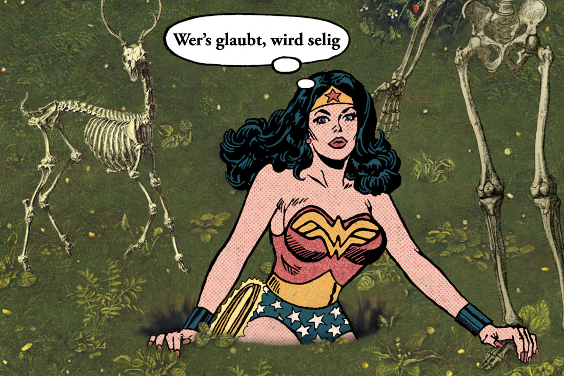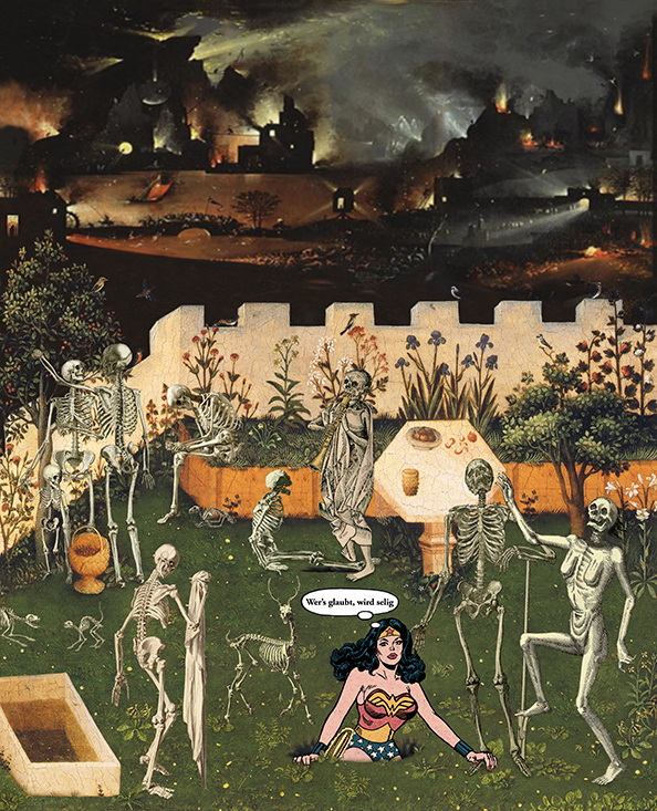 All diese Bildteile sind nun mit Wonder Womans Denkblase verwoben, in der zu lesen steht: „Wer‘s glaubt, wird selig“. – Die Existenz eines (jenseitigen) Paradieses bleibt wohl eine persönliche Glaubensfrage, dass Kriege ständige Begleiter der Lebenden im Diesseits sind, leider nicht.