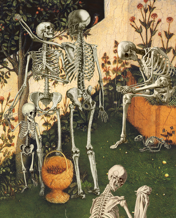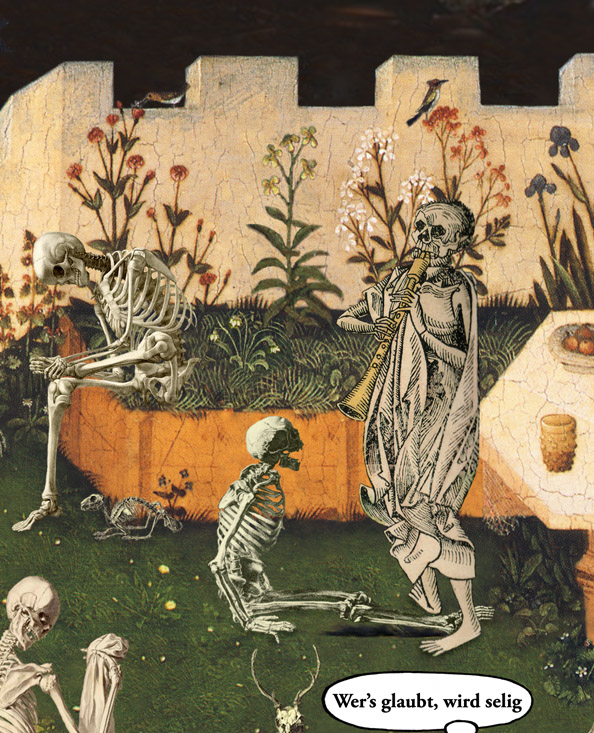 In das jenseitige Paradiesgärtlein des Oberrheinischen Meisters, gemalt um 1415, habe ich Teile der Wiese des Genter Altars (1432) der Gebrüder van Eyck eingefügt. In diesem neu geschaffenen hortus conclusius tummeln sich gutgelaunte ehemalige Erdbewohner, wie beispielsweise der Mann, aufgestützt auf seinen Spaten. Er ist aus Andreas Vesalius‘ Meilenstein der Medizingeschichte entnommen, der siebenbändigen Schrift „De Humani Corporis Fabrica Libri Septem“, veröffentlicht im Jahr 1543. Vesalius, Leibarzt Karls V, gilt als der Begründer der neuzeitlichen Anatomie.