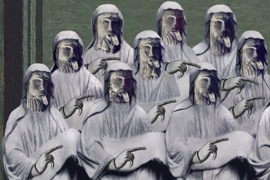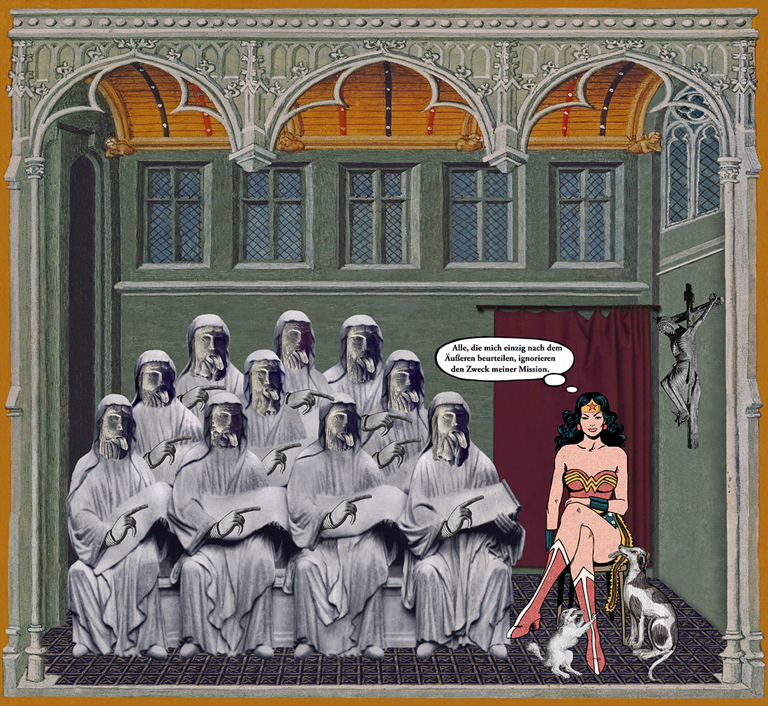 Wonder Woman trifft in dieser Collage auf eine in Stein gemeißelte Gruppe von zu Gericht sitzenden Männern, die ein (juristisches) Spruchband entrollt haben. Ihre Zungen bleckend zeigen sie auf die Amazone. Die zehn steinernen Männer sind als Vervielfachung des gotischen Archetyps eines sozial Höhergestellten entstanden und besitzen kaum Individualität, ihre Gesichter erscheinen maskenartig. Einzig ihre Bärte bieten schwache Hinweise auf verschiedene Persönlichkeiten.