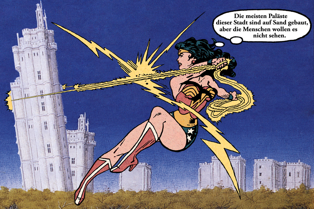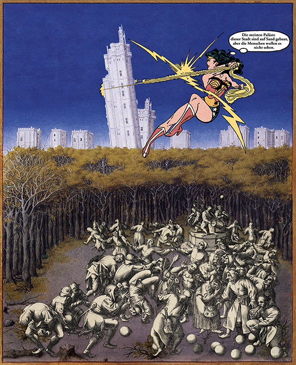 Dieses sehen wir hier beim „Fest der Narren“ von Pieter Brueghel dem Älteren (um 1550). Ein besinnungslos feierndes Volk trifft sich auf einer Waldlichtung im Dezemberblatt des „Stundenbuchs des Herzogs von Berry“, das zu den berühmtesten illustrierten Manuskripten des 15. Jahrhundertszählt. Es wurde von den Gebrüdern Limburg um 1415 gemalt. Die Szene spielt in den Wäldern bei Vincennes, dessen gleichnamiges Schloss Wonder Woman vor dem Versinken bewahren will.