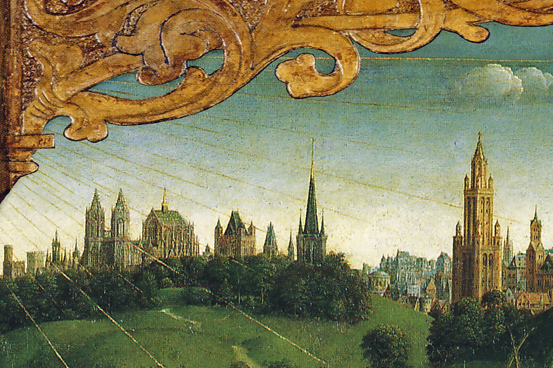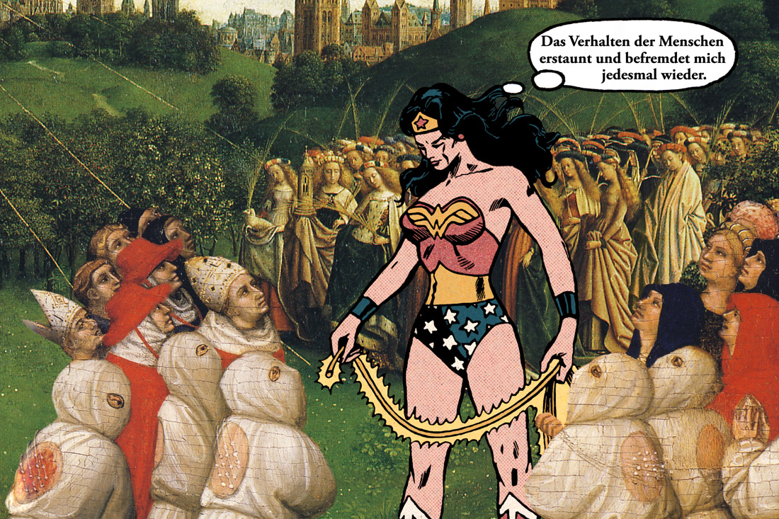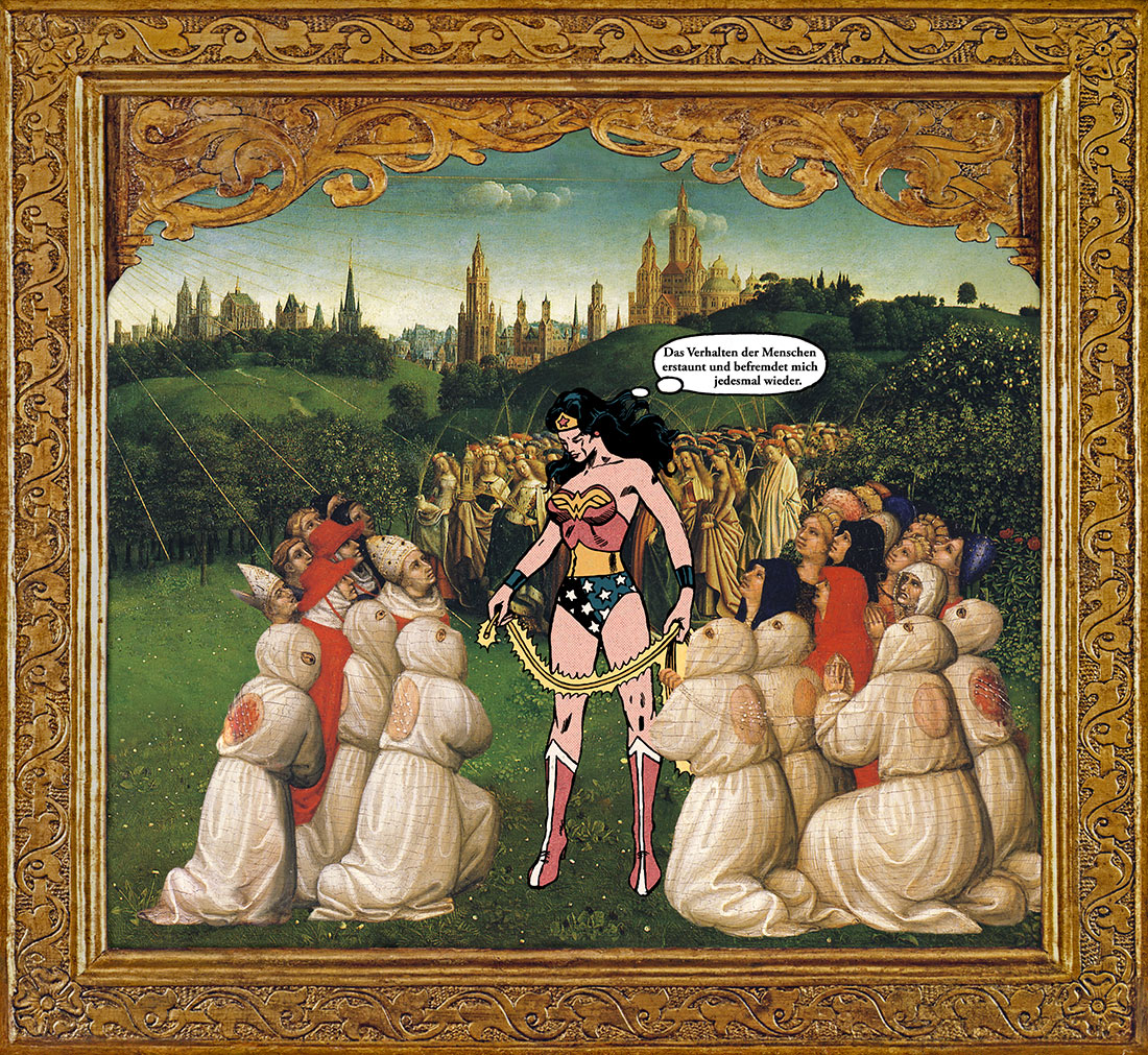 Eingebettet in die Bilderwelt des „Genter Altars“ der Brüder Van Eyck, vollendet 1432, steht Wonder Woman mit dem goldenen Lasso, das Menschen dazu bringt, nur aufrichtige Antworten zu geben. Im Hintergrund sehen wir eine Prozession, die zur Anbetung des Erlösung versprechenden Lammes Gottes pilgert.