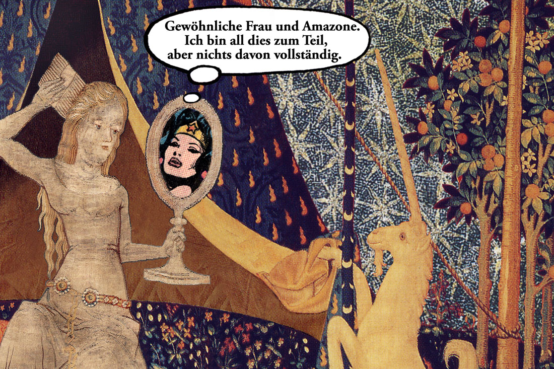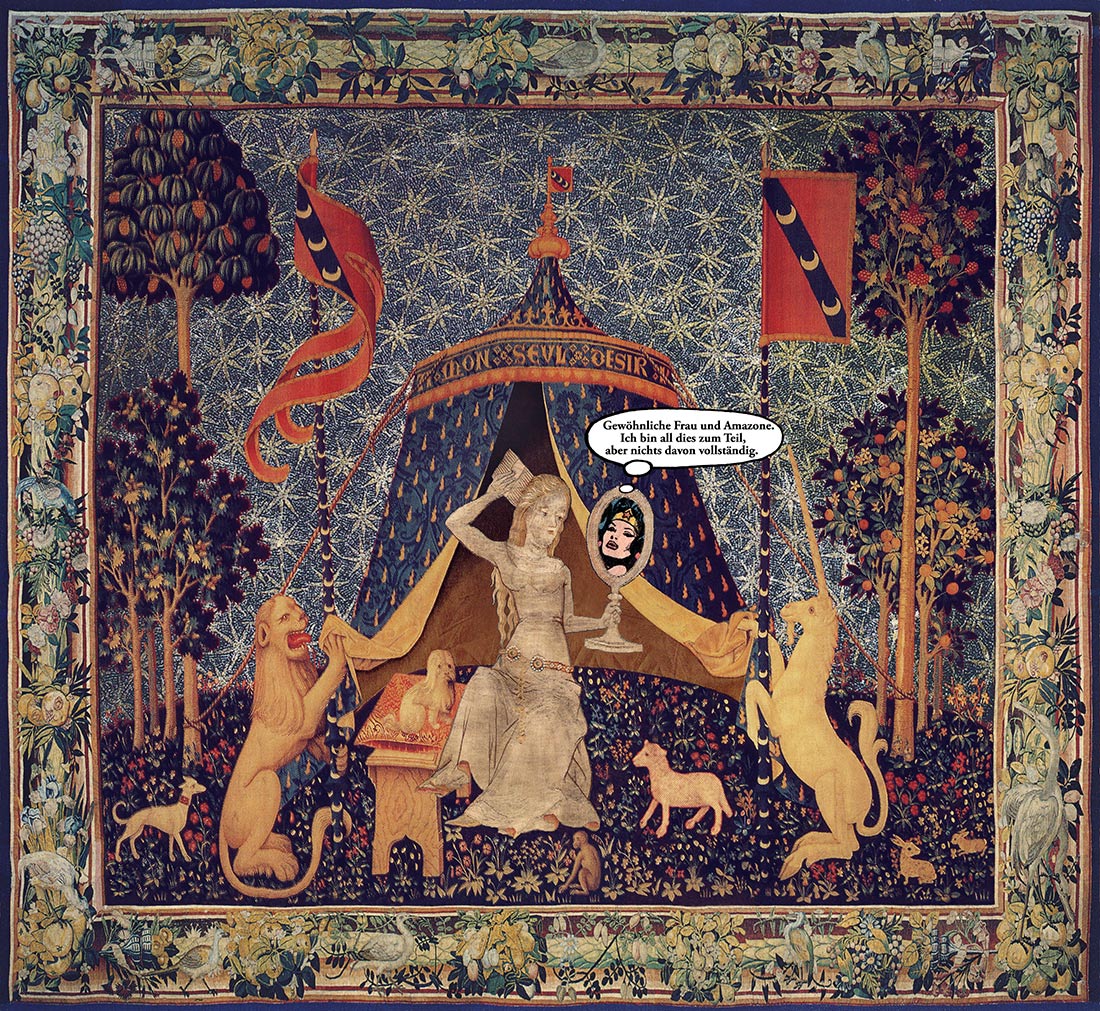 Die Frau blickt in den Spiegel, sich (auch) als Amazone erkennend. Zwei Texte sind also in diesem Bild zu lesen: „À mon seul désir“ und „Gewöhnliche Frau und Amazone. Ich bin all dies zum Teil, aber nichts davon vollständig“.