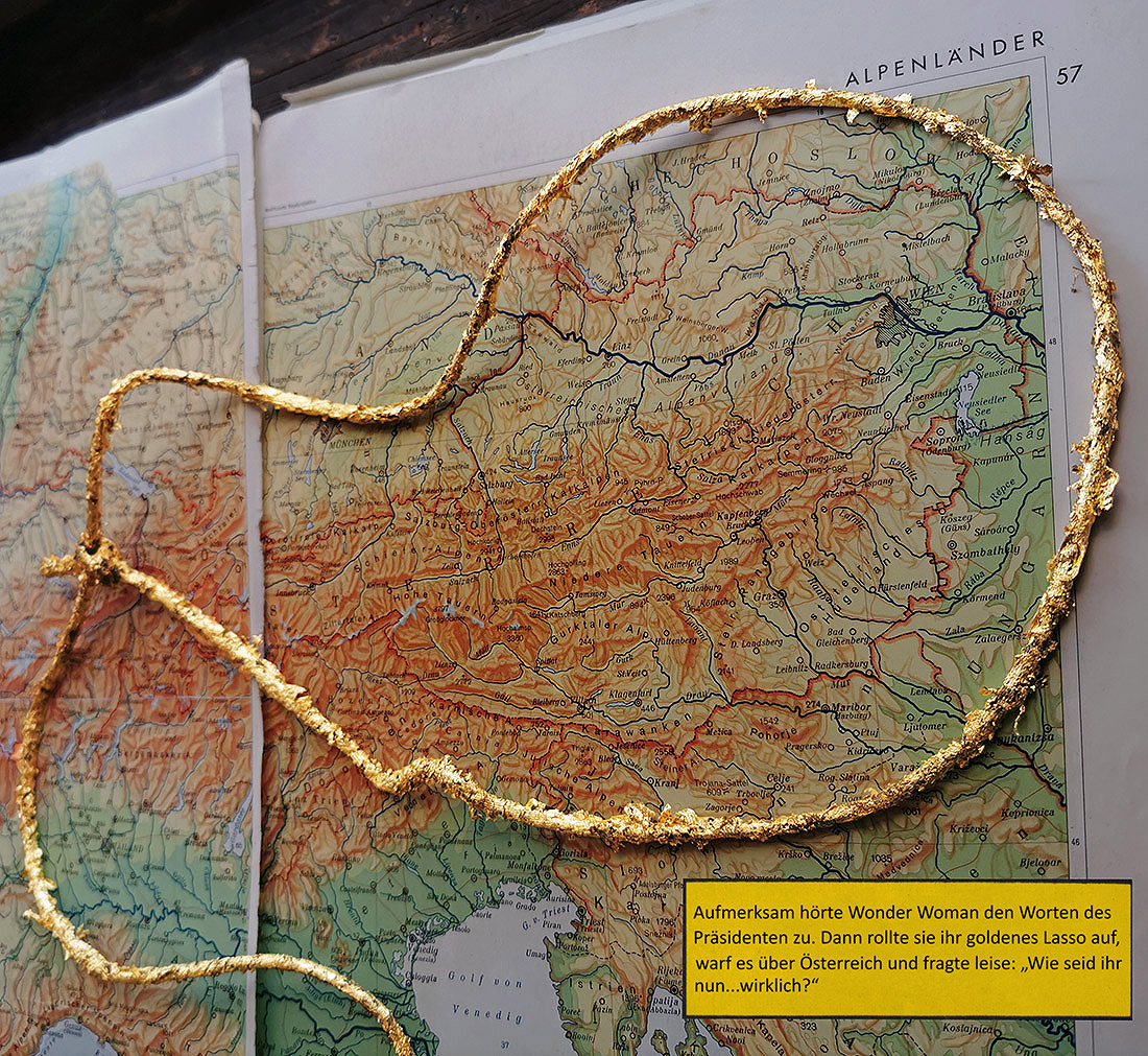 Auf diese Rede bezieht sich im gelben Textfeld die von Wonder Woman gestellte Frage. Um der Wahrheit auf die Spur zu kommen, hat sie ihr goldenes Lasso auf die Landkarte „Alpenländer“ geworfen. Diese ist auf Seite 57 des in rotes Leinen gebundenen Österreichischen Atlas für höhere Schulen, Ed. Hölzel / Wien, zu finden.