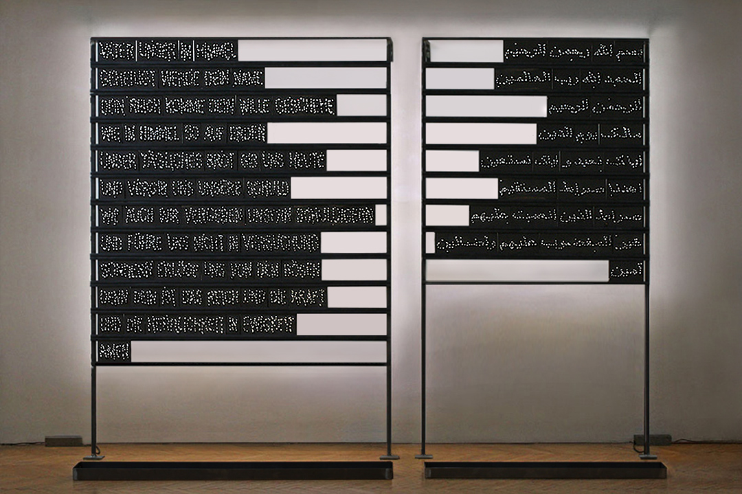 Zwei große Metallrahmen, in denen sich durchlöcherte schwarze Keramiktafeln aneinanderreihen. Hunderte Lichtpunkte strahlen durch die kleinen Öffnungen wie Sterne in der Nacht. Treten wir aber zurück, entstehen aus der Illusion einer nächtlichen Himmelsdarstellung die Worte von Gebeten. Die Texte des „Vater Unser“ und die arabischen Schriftgirlanden der „Ersten Sure des Koran“ werden plötzlich lesbar. Worte, die seit Jahrhunderten Kraft spenden, Trost schenken und die für Millionen von Menschen Ausdruck tiefen Glaubens sind.