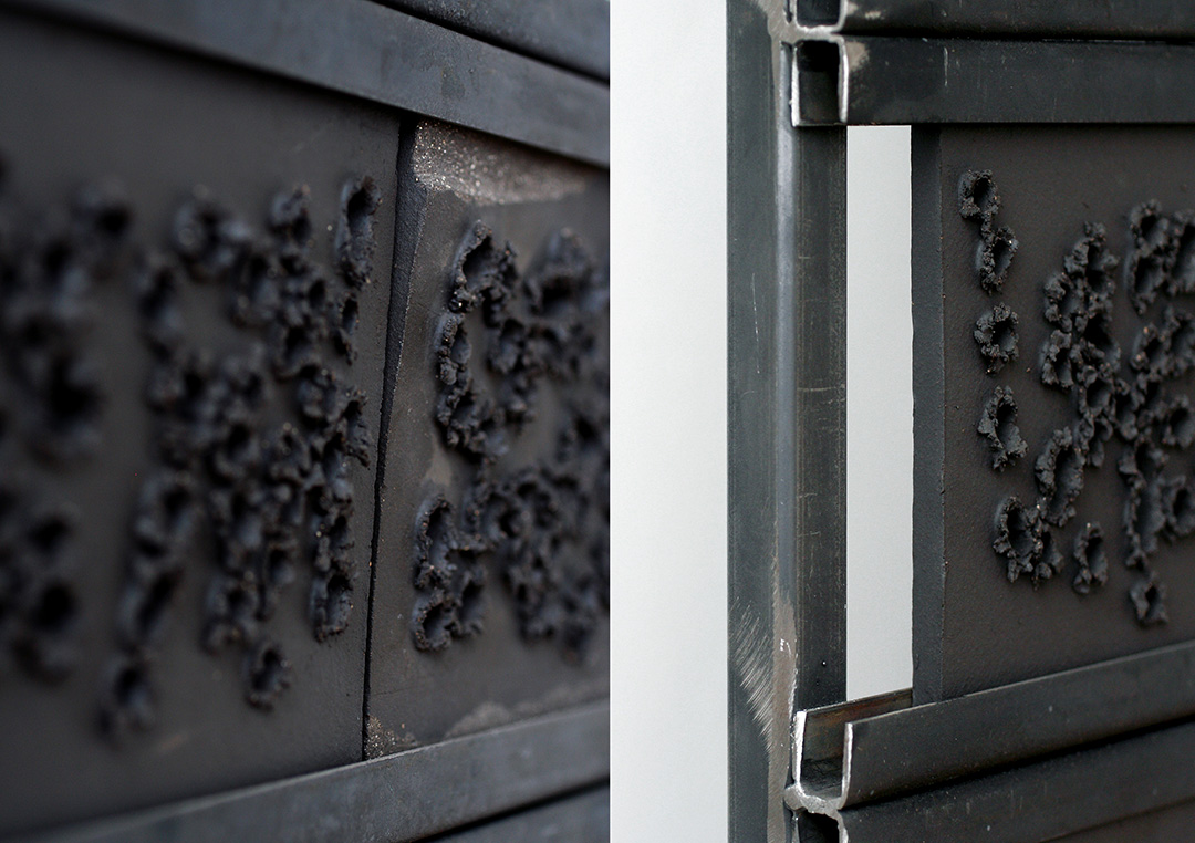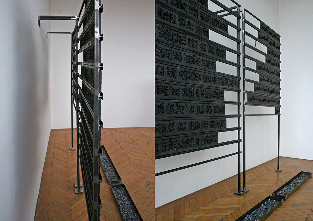 Doch die schwarzen Worttafeln zeigen Spuren ihrer Entstehung: Ich habe die Buchstaben vor dem Brennen in die noch weichen Tonfliesen hineingeschossen, vor den Metallgerüsten liegen Eisenwannen mit den verschossenen Bleiprojektilen.