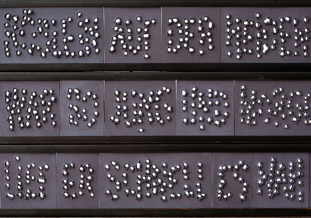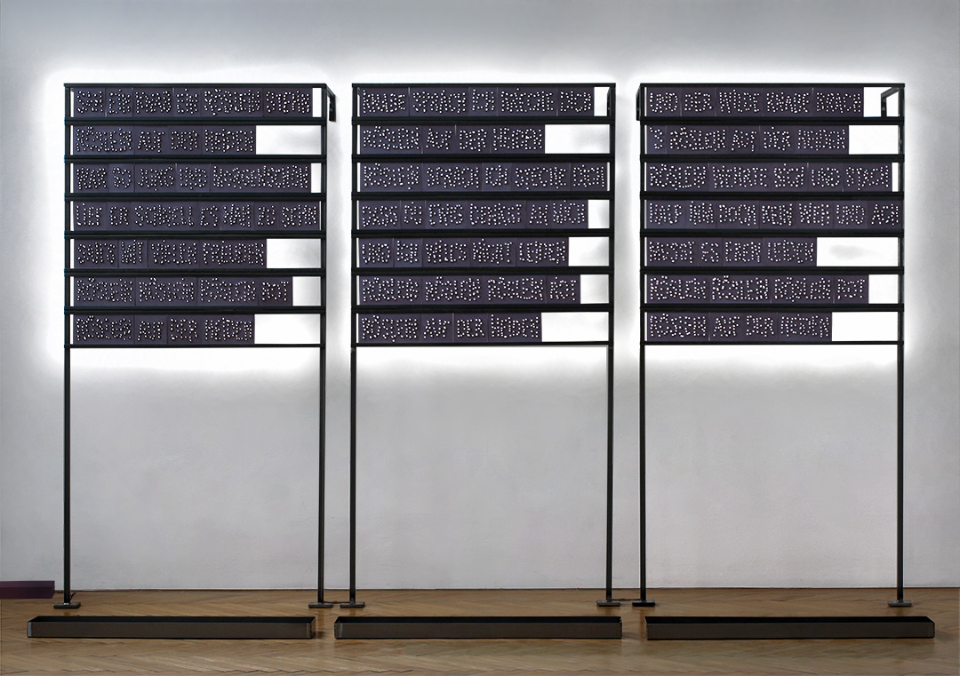 Hinterleuchtet mit weißen LED-Streifen, lassen sich rückseitig auch durchsichtige orange Kunststofffolien anbringen, die zwischen 25. November (dem Internationalen Tag gegen Gewalt an Frauen) und 10. Dezember (dem Tag der Menschenrechte) die Installation in oranges Licht tauchen können.