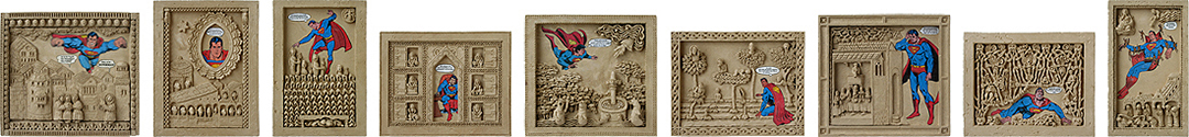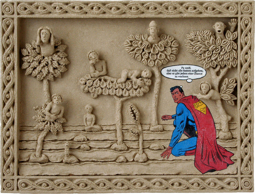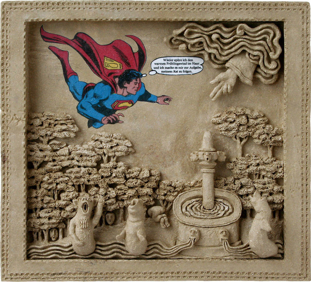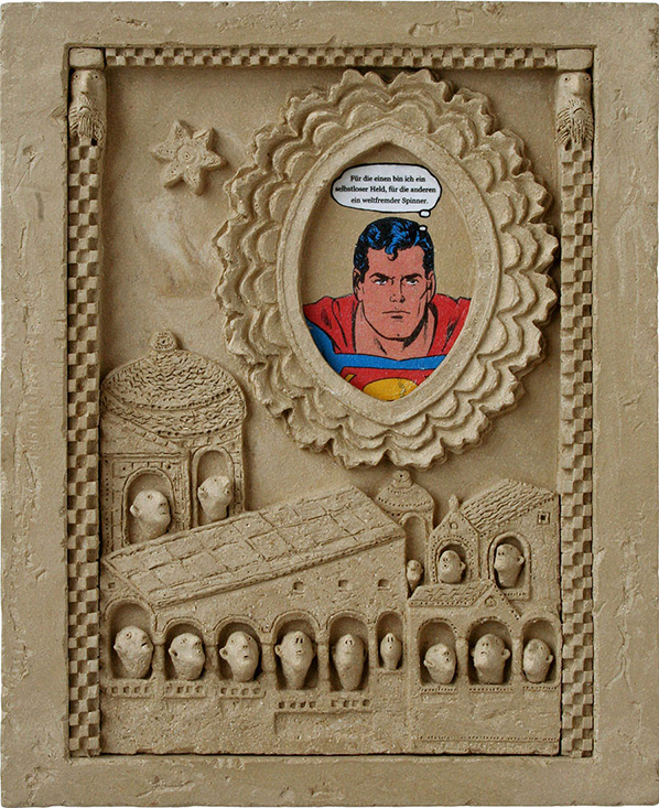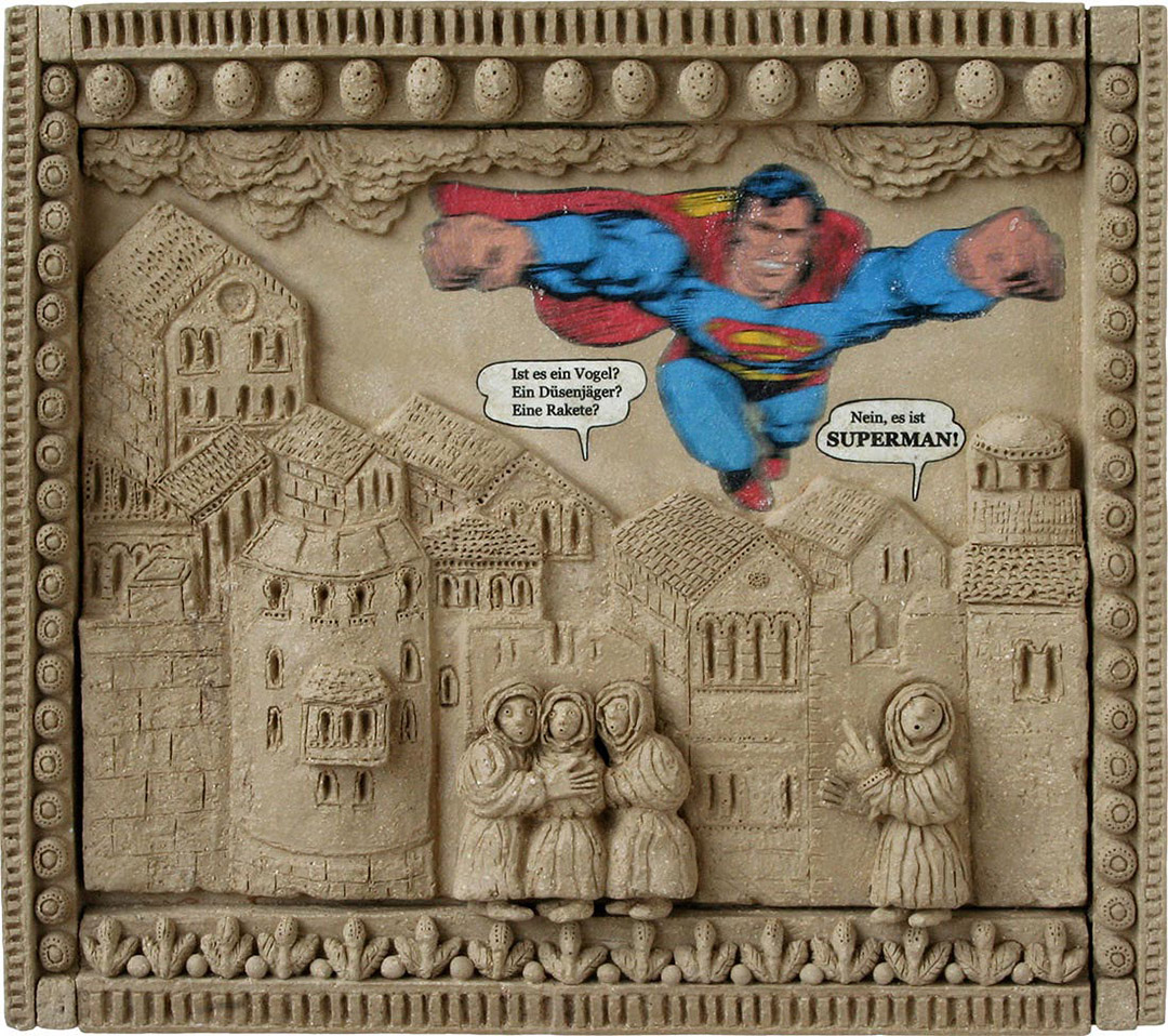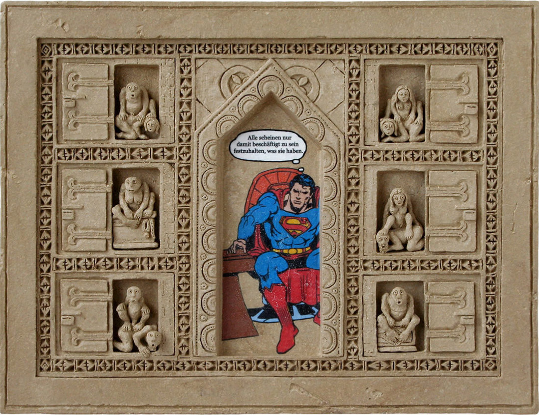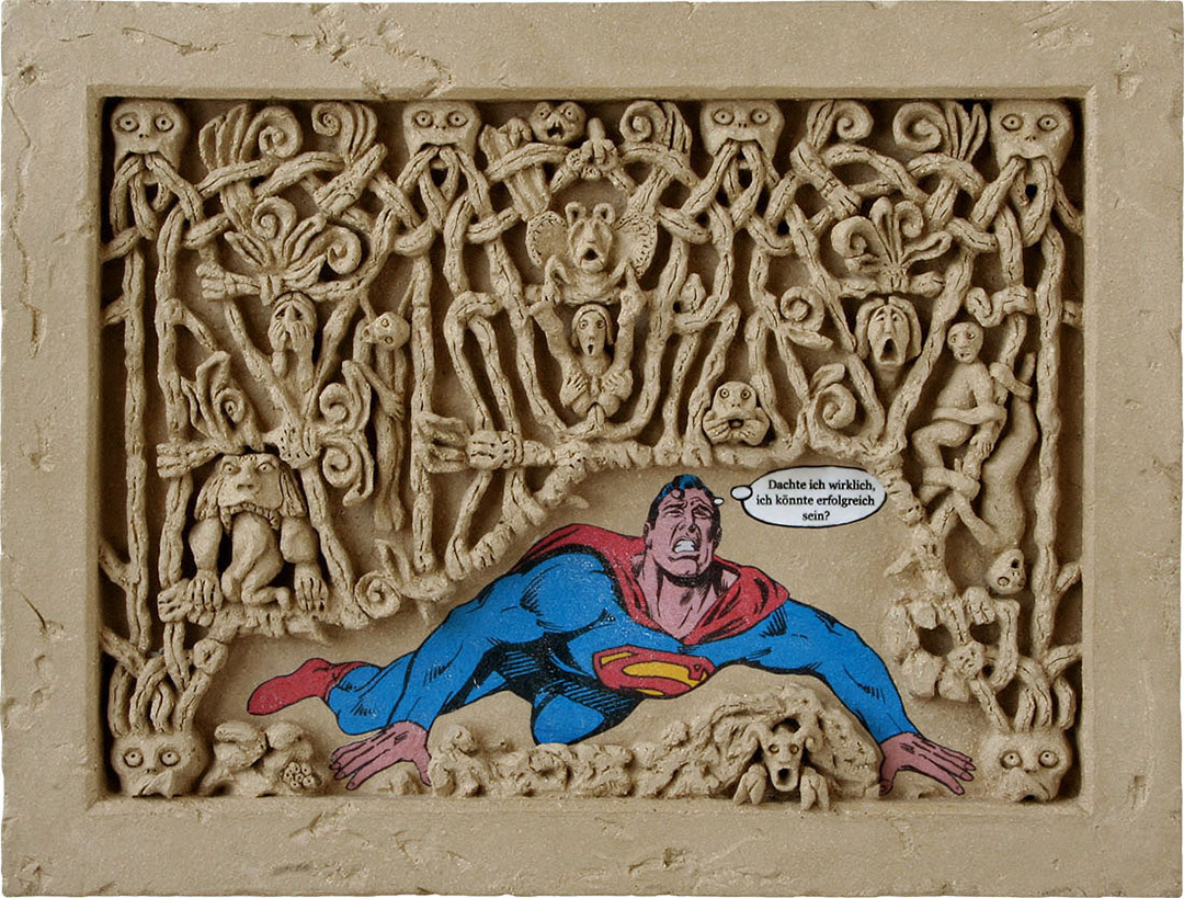 In einer an die Romanik erinnernden Formensprache dient hier unglasierter Ton zur scheinbar naiven Darstellung einer archaischen, von expressiven Menschen und Tieren besiedelten mittelalterlichen Welt. Im Gegensatz dazu steht Superman in seinem blau-roten Kostüm, als computergeneriert bedruckte Folie auf den bereits hochgebrannten Ton appliziert. Der Kontrast dieser beiden unterschiedlichen Darstellungstechniken illustriert auf neun Relieftafeln den Zusammenprall zweier verschiedener Zeitalter. Das darin erzählte Aufeinandertreffen von Superman, als Heilsbringer und Nothelfer, mit der hilfsbedürftigen, doch undankbaren und ihn letztlich tötenden Menschheit ist die neu interpretierte Geschichte des Kreuzwegs Christi.