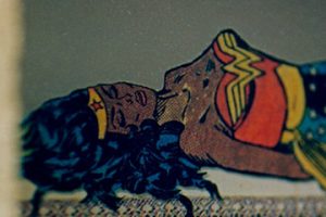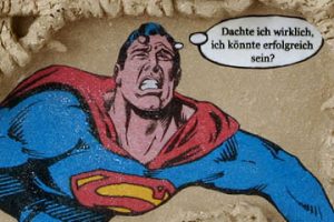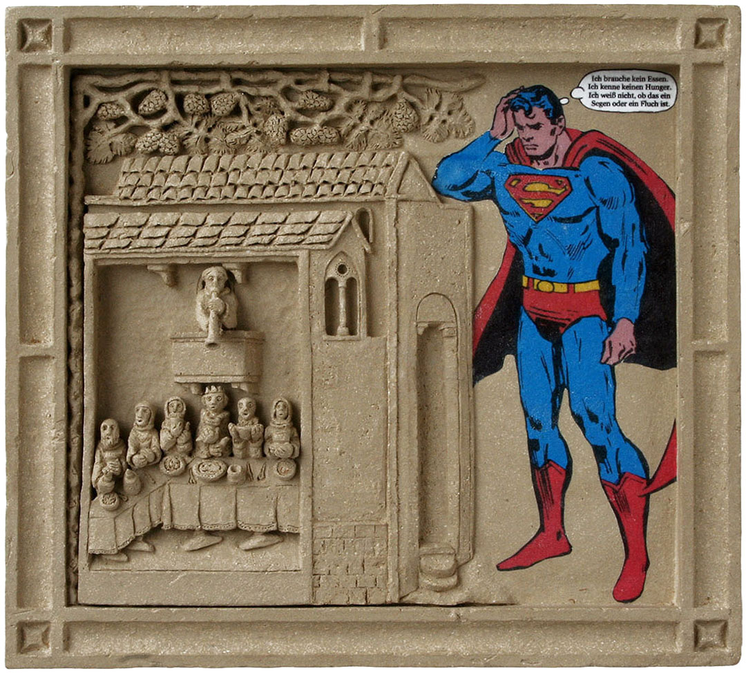 „In einem komfortablen Haus, das uns an italienische Malerei erinnert, beobachtet Superman ein Festgelage von glücklichen Menschen, die essen, trinken, Musik hören. Sogar Trauben hängen über dem Dach in Hülle und Fülle. Superman steht draußen vor der Tür und schaut verwirrt, fast unglücklich hinein. Wie ist das zu verstehen? Er, der Superheld, braucht kein Essen, muss nicht trinken. Jede Spur von Sinnlichkeit ist ihm erspart. – Gott sei Dank?