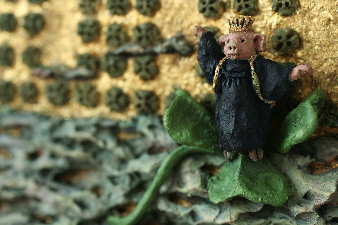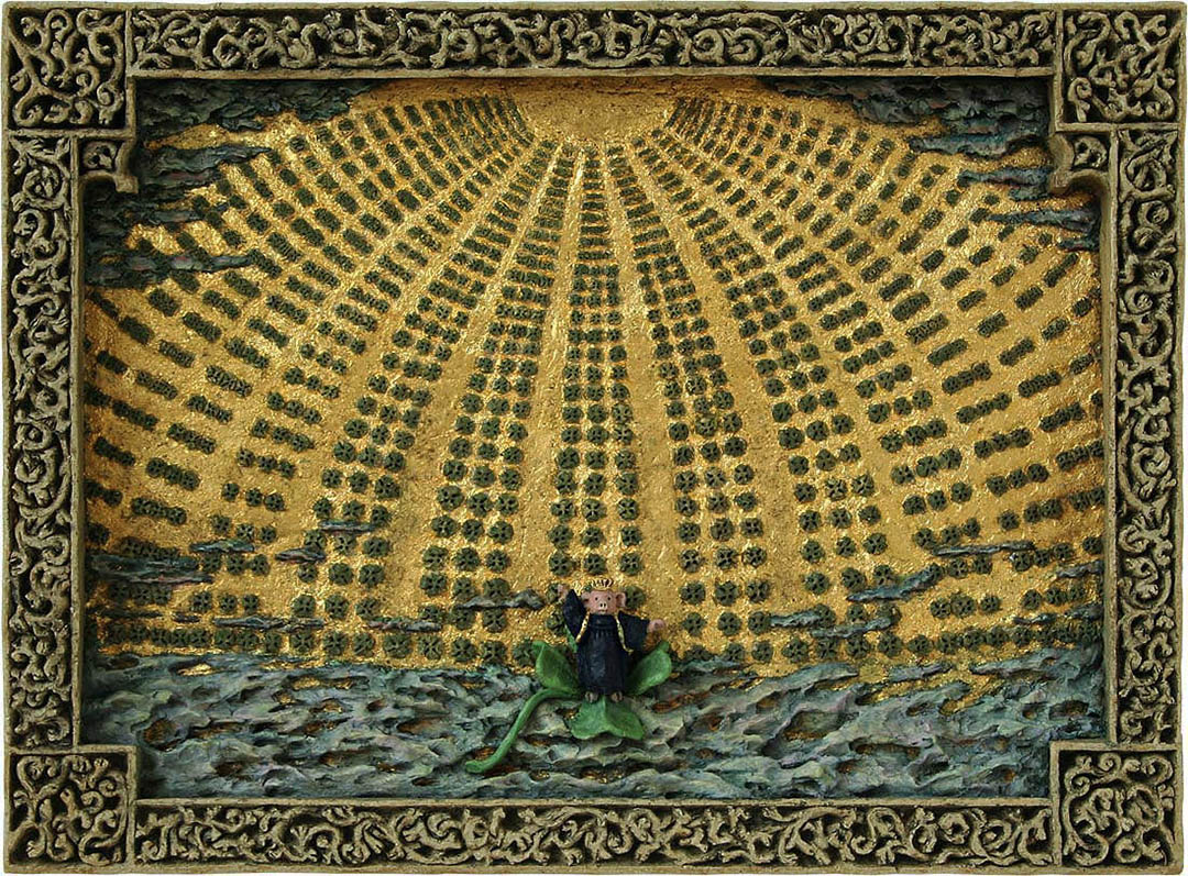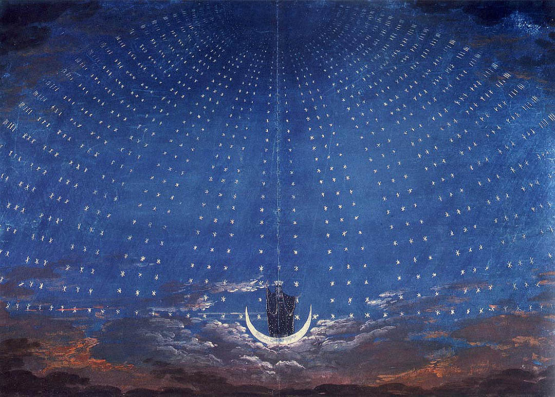 Die Wandskulptur „Königin des Glücks“ nimmt Bezug auf Karl Friedrich Schinkels Bühnenbild zu Mozarts Zauberflöte. Die „Sternenhalle im Palaste der Königin der Nacht“ entstand als einer der berühmtesten Bühnenbildentwürfe weltweit im Jahre 1816 für das „Opernhaus unter den Linden“ in Berlin.