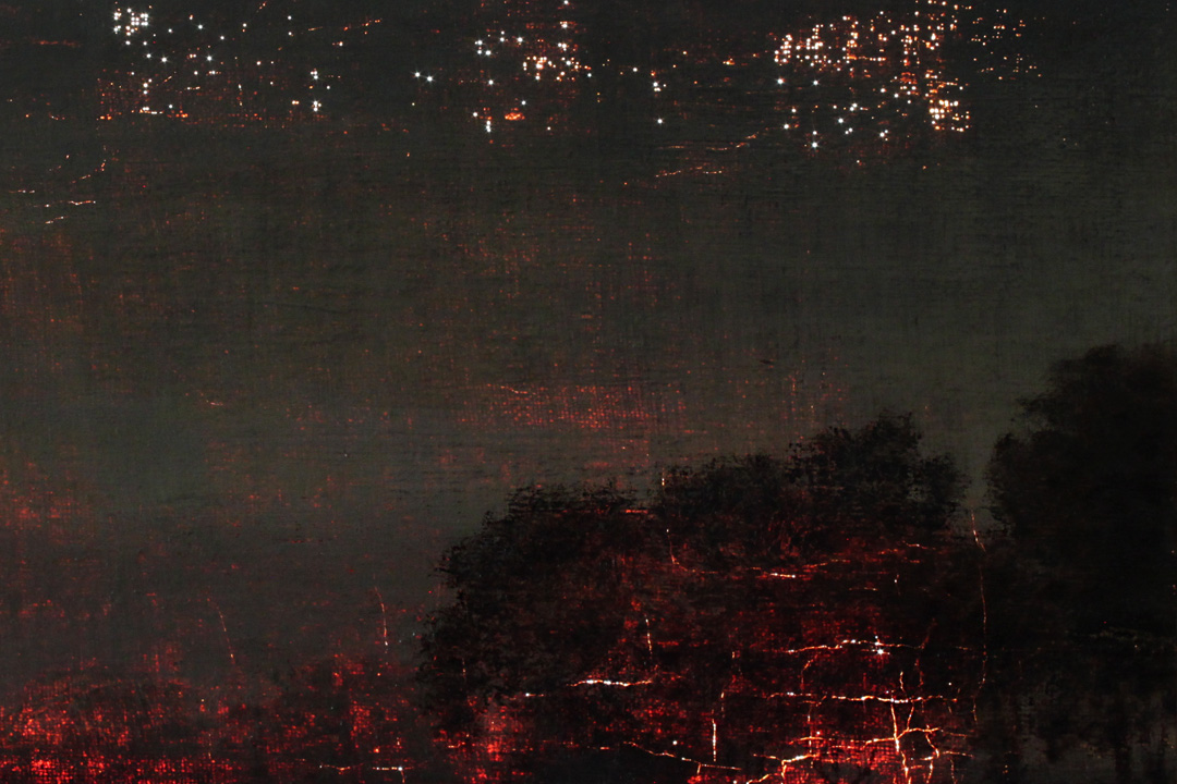 Ein altes, hinterleuchtetes Ölgemälde einer dunklen Waldlandschaft wirkt wie eine visuelle Entsprechung zu Georg Trakls expressionistischer Lyrik. Risse in der Leinwand lassen eine rote Grundierung durchscheinen, Erinnerungen an für Trakl typische Motive wie Blut, Herbst und Untergang. Winzige Löcher im Himmelsbereich der Leinwand werden zu Lichtpunkten und erzeugen einen künstlichen Sternenhimmel, Symbol unerreichbarer Transzendenz, melancholischer Schönheit oder spiritueller Hoffnung. Und darunter duckt sich der Wald auf Erden als stiller, rissig roter Abgrund, in dem Trakls Schatten wandern.