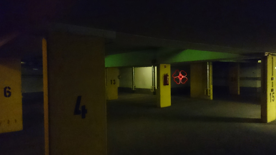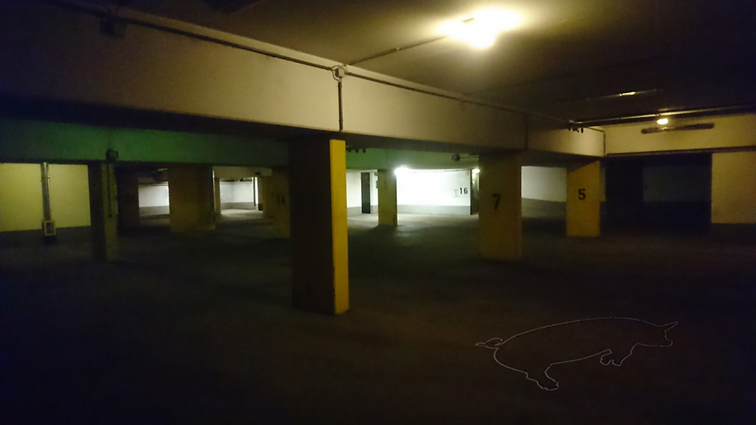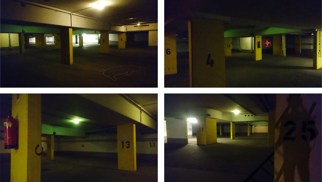 In der Tiefgarage, Allegorie für das Unterbewusste, für Sorgen und Ängste, sind die Glückssymbole nicht Boten der Hoffnung, denn an diesem unbehaglichen Ort wirken selbst sie unheimlich, der Kontrast zwischen der düsteren Architektur und den naiven Glückssymbolen erzeugt eine verstörende Irritation.