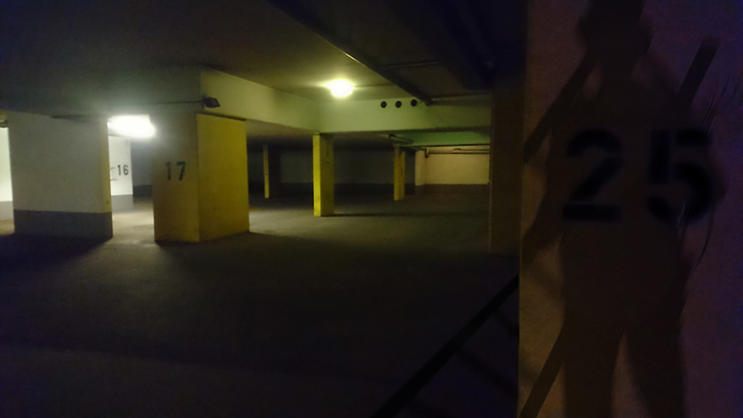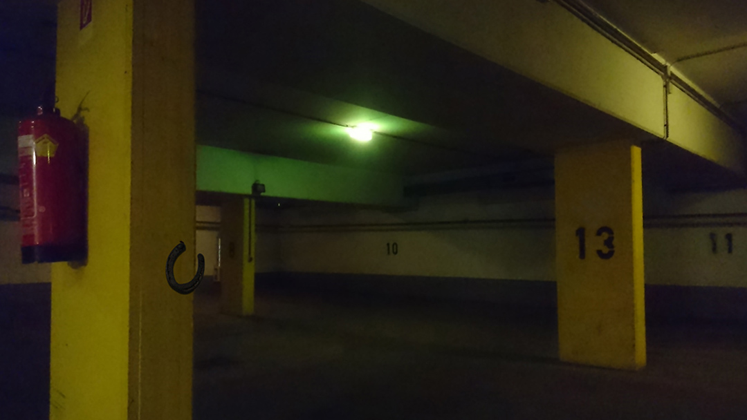 Meine vierteilige Fotoserie führt in eine düstere Tiefgarage, die dominanten Farben sind Betongrau, schwarz und grünliches Gelb, selbst Autos scheinen den Ort zu meiden. Doch inmitten dieser Tristesse nehmen wir vier Glückssymbole wahr: Ein Schwein auf staubigem Boden, ein Hufeisen neben dem Feuerlöscher, ein vierblättriges Kleeblatt, das rot in der Dunkelheit glimmt, und den Schatten eines Rauchfangkehrers an einer Wand.
