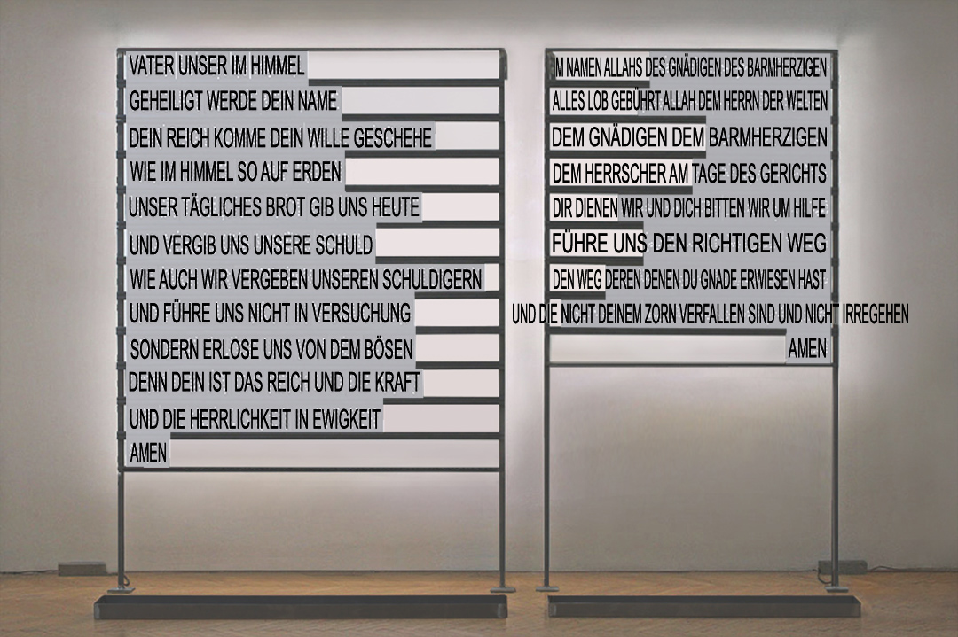 Zwei große Metallrahmen, in denen sich durchlöcherte schwarze Keramiktafeln aneinanderreihen. Hunderte Lichtpunkte strahlen durch die kleinen Öffnungen wie Sterne in der Nacht. Treten wir aber zurück, entstehen aus der Illusion einer nächtlichen Himmelsdarstellung die Worte von Gebeten. Die Texte des „Vater Unser“ und die arabischen Schriftgirlanden der „Ersten Sure des Koran“ werden plötzlich lesbar. Worte, die seit Jahrhunderten Kraft spenden, Trost schenken und die für Millionen von Menschen Ausdruck tiefen Glaubens sind.