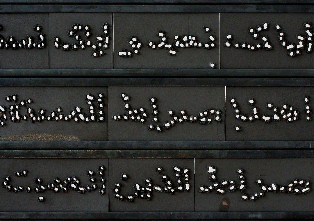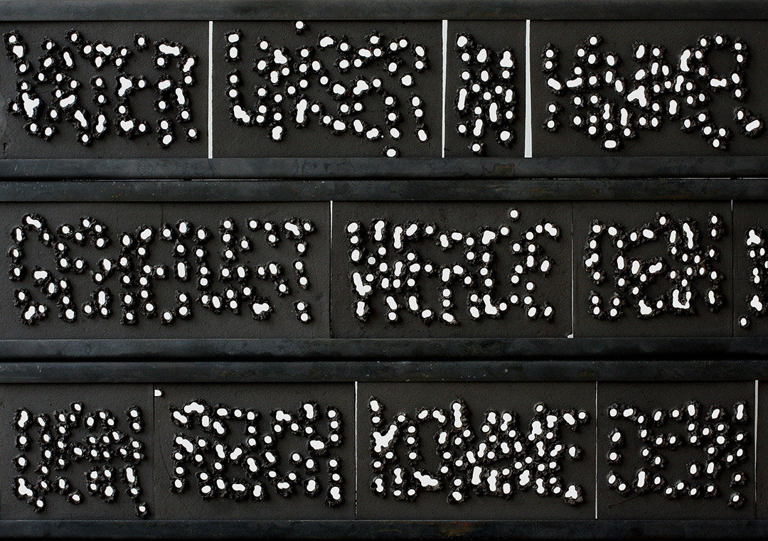 Doch die schwarzen Worttafeln zeigen Spuren ihrer Entstehung: Ich habe die Buchstaben vor dem Brennen in die noch weichen Tonfliesen hineingeschossen, vor den Metallgerüsten liegen Eisenwannen mit den verschossenen Bleiprojektilen.
