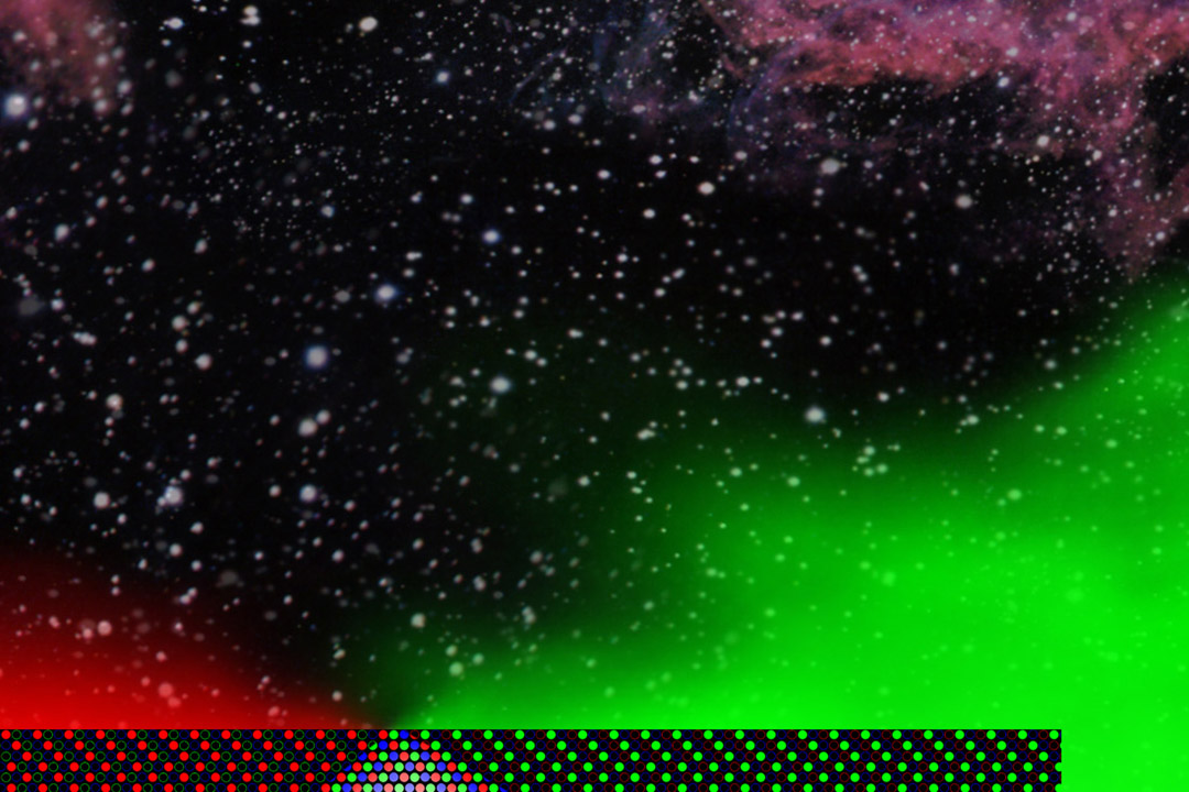 Die Dreifaltigkeit ist per definitionem Bild des Göttlichen, für den Menschen nicht in seiner Ganzheit vorstellbar, daher auch nicht abbild- oder darstellbar. Meine computergenerierte Grafik sucht daher nach einer Metapher für das Transzendente und findet sie im Diesseitigen, nämlich im naturwissenschaftlichen Prinzip der additiven Farbmischung, wie es auch bei der Farbdarstellung durch die Lochmaske des Röhrenmonitors angewendet wird. Erst im menschlichen Auge und Gehirn entsteht aus den drei primären Lichtfarben Rot, Grün und Blau die Lichtfarbe Weiß.